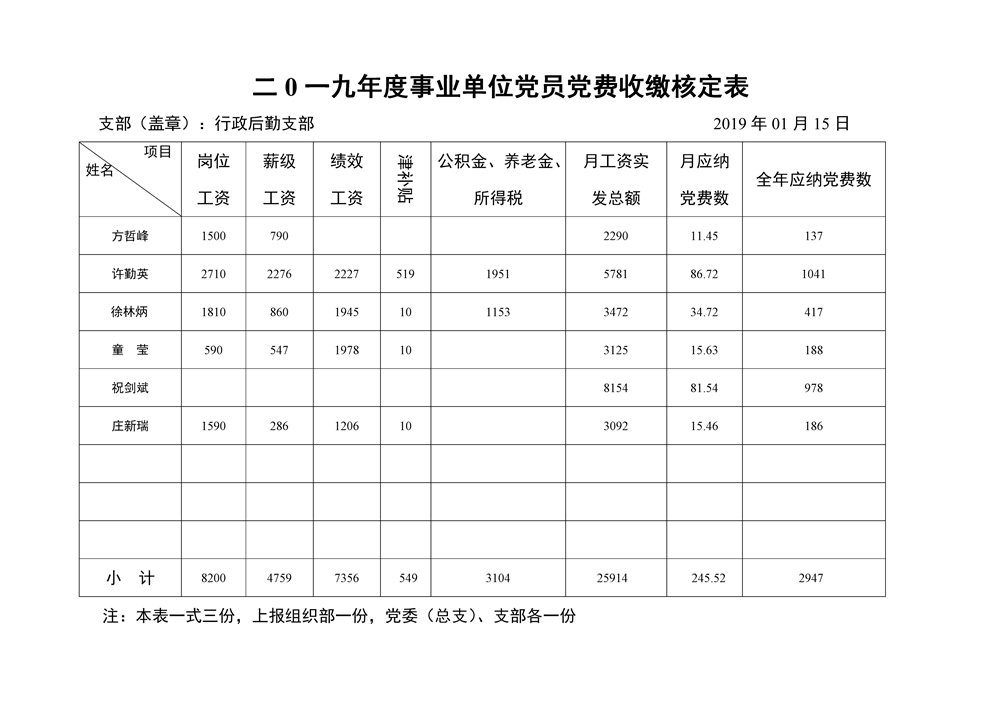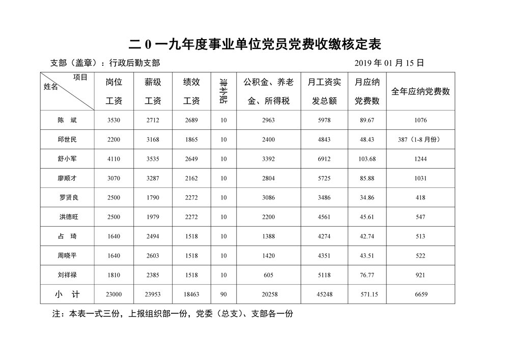 二0一九年度事业单位党员党费收缴核定表